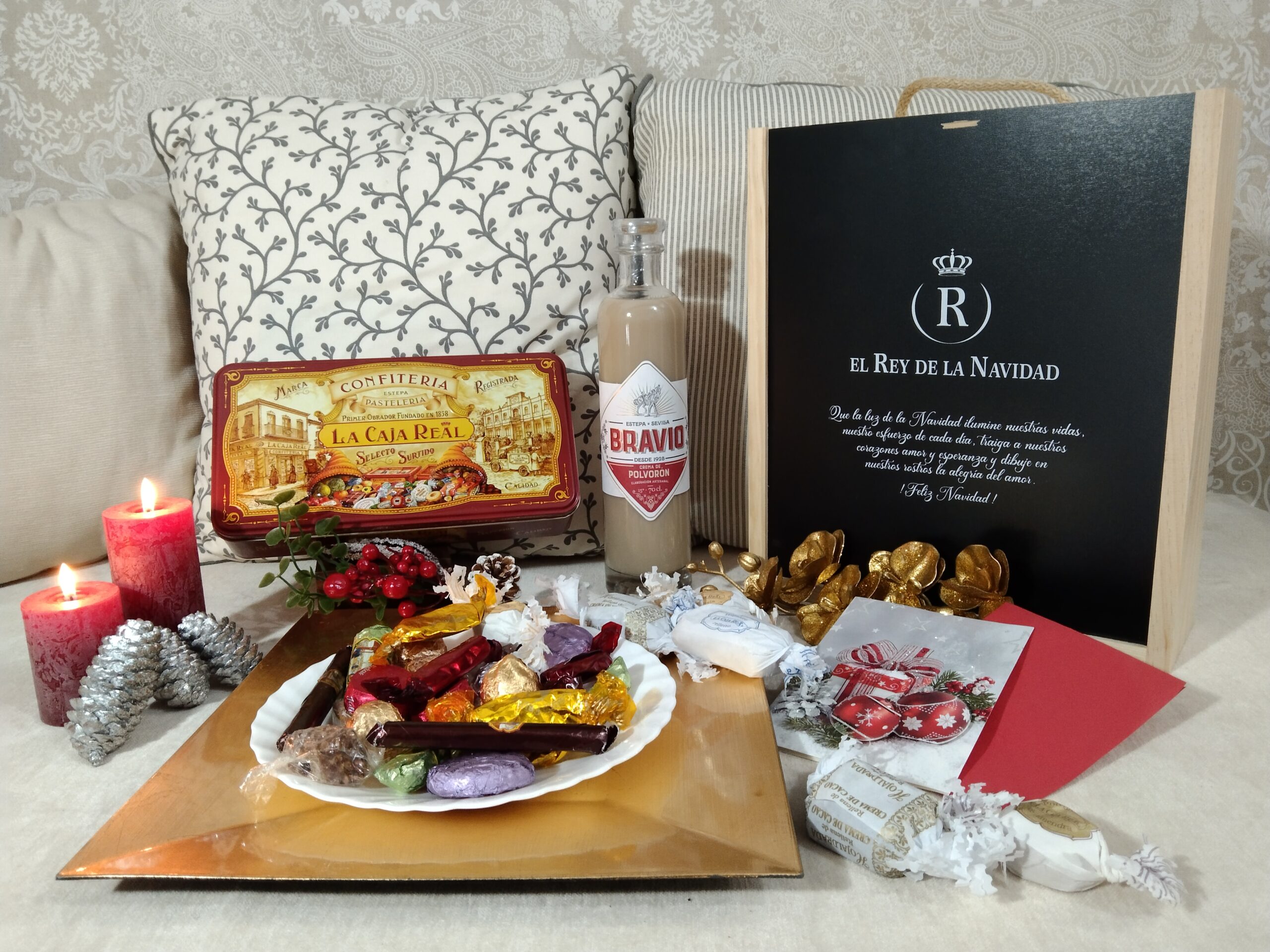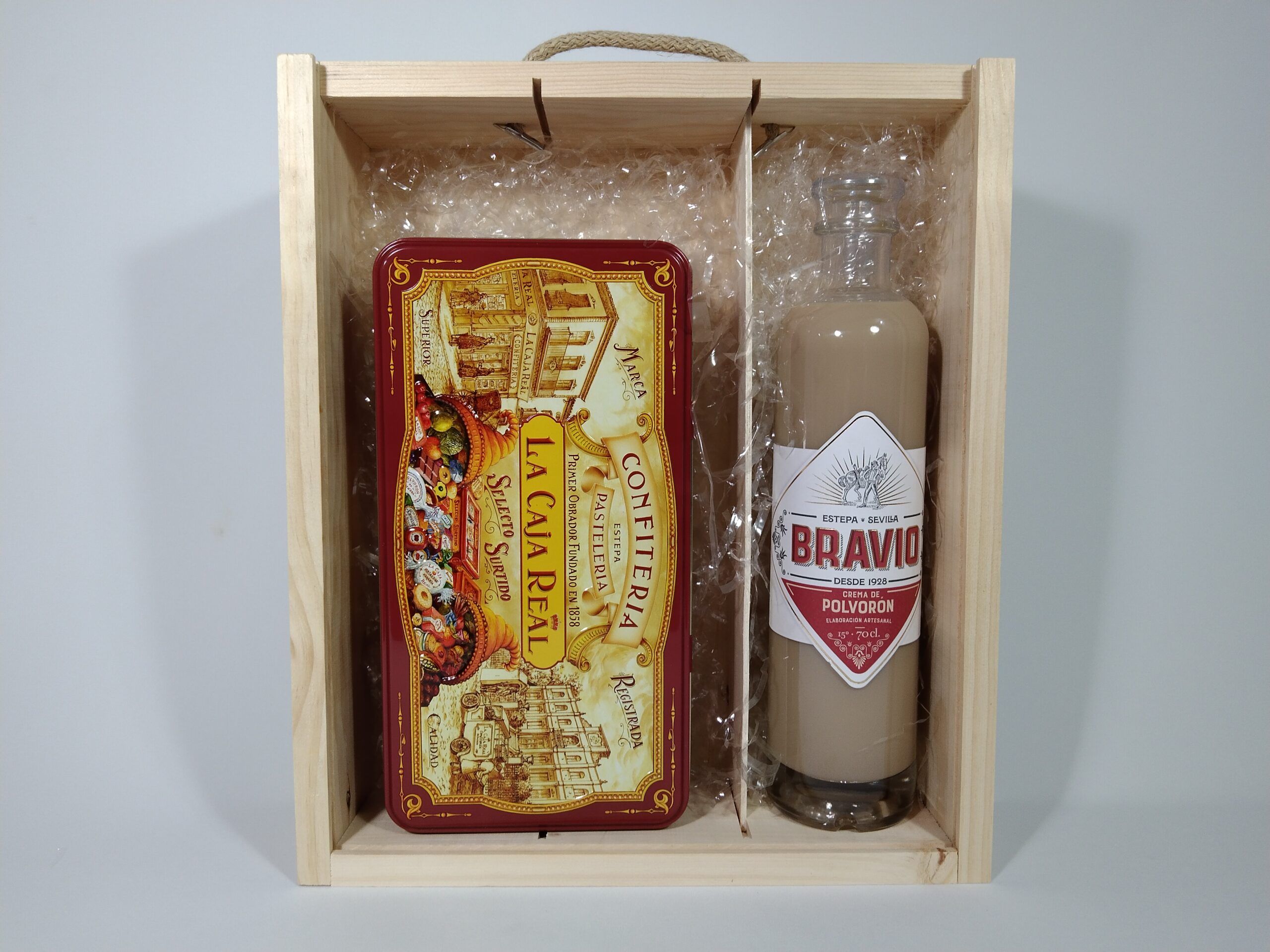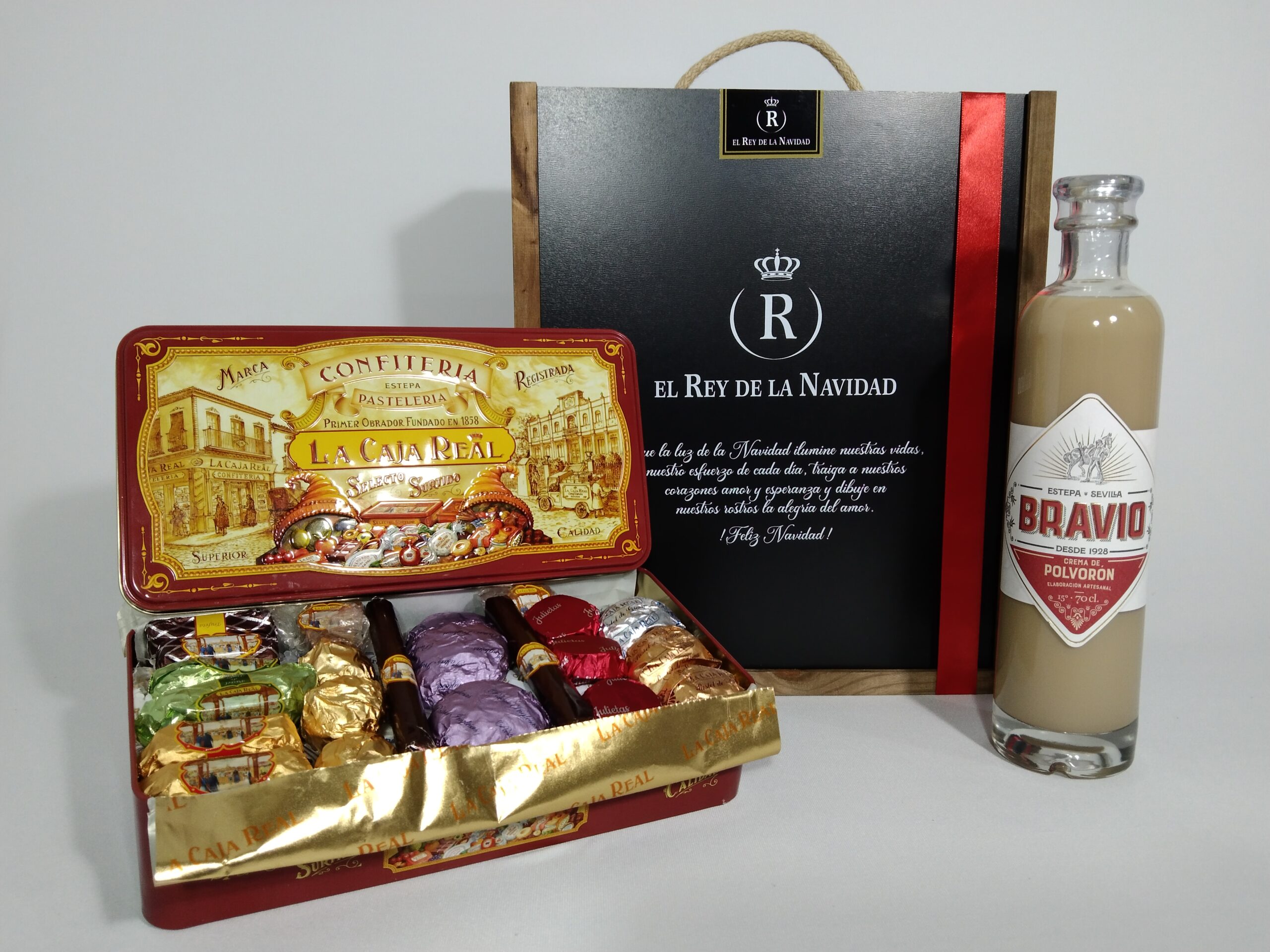 CONTENIDO DE LA CAJA REAL: Mantecaditos, Polvoroncitos, Hojaldradas de Naranja, de chocolate, Alfajores sevillanos, Bocaditos de Almendra, Lunas de Naranja, Nanitas, Galetines mil noches, Trufetas, Pastas Inglesas, Pastel de Gloria, Pastel de Yema, Canutines, Petras, Pastel de Pistacho y, Torta Cortesana de Chocolate.