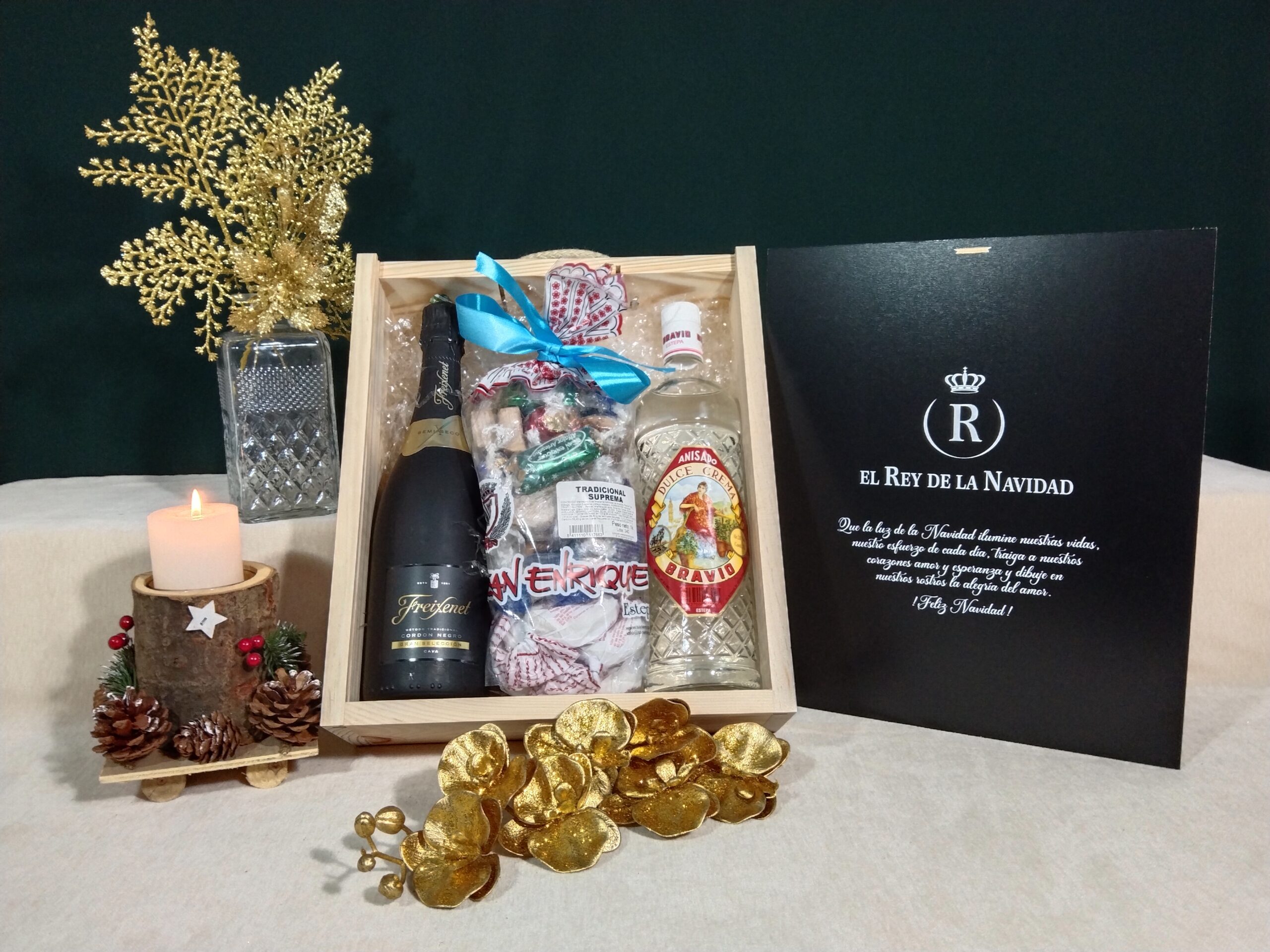 1. BOLSA SURTIDA a granel (1kg.) TRADICIONAL SUPREMA. Obrador artesano SAN ENRIQUE OBRADOR SAN ENRIQUE: es una empresa de carácter familiar. Nace en 1928 al amparo de una fábrica de chocolate, cuyos datos de origen son anteriores a 1830. Han conseguido que sus productos sean de una calidad máxima a base de una dura selección de las materias primas y una elaboración extraordinariamente esmerada. CONTENIDO DE LA BOLSA: Mantecados de Artesanía, Polvorón Suprema, Deliciosas de Almendra, Roscos de vino tipo Málaga y Alfajor Artesano. 2. BOTELLA de CAVA Freixenet “Gran Cordón Negro” (75 cl.) Poco se debió imaginar Pere Ferrer Bosch, hijo de una familia que vivía en una “Freixeneda” (bosque de fresnos en catalán), que su apodo iba a llegar tan lejos. Y es que desde que inició su aventura como elaborador de cava en 1914 en Sant Sadurni d´Anoia (Cataluña) su marca Freixenet se ha convertido en el primer productor a nivel mundial. Entre sus referencias en 1974 lanza al mercado CORDON NEGRO, un cava ligero, fresco y aromático que conquista rápidamente y se convierte en líder en exportación. Elaborado con las tres uvas clásicas del Penedés, es uno de los espumosos más sofisticados de todos cuantos elabora Freixenet. Es un cava de burbuja abundante, fina y persistente, muy integrada, buen desprendimiento de carbónico formando buena corona. Con aromas finos y delicados, predominando los tonos de fruta verde (manzana, pera) ligeros matices de fruta tropical madura (plátano, notas de piña), fondos cítricos y de hierbas frescas. En boca se muestra fresco y ligero. 3. BOTELLA de ANIS “DULCE CREMA” (1L) El Anís Dulce es una bebida que, aunque se puede consumir en cualquier época del año, está íntimamente ligado a nuestra historia y a muchas celebraciones a lo largo del tiempo. Tradicionalmente se toma en Navidad combinando su sabor con exquisitos dulces como los mantecados y polvorones. “DULCE CREMA” es un anís suave, fresco y aromático, que se elabora con una receta exclusiva que se ha transmitido de generación en generación, con extractos de anís verde procedente del Mediterráneo, además de otras diez plantas y especias 4. CAJA DE MADERA