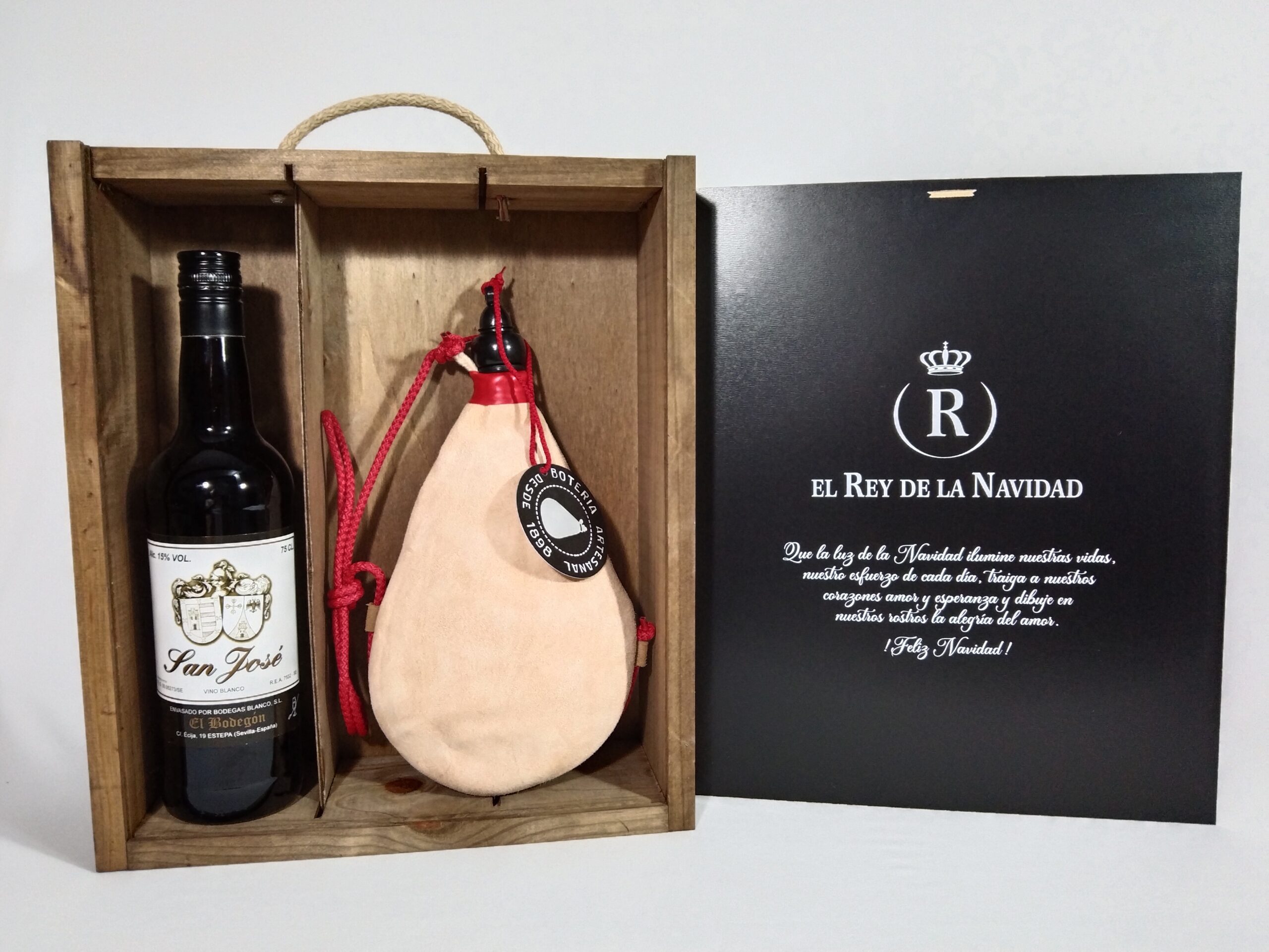 2) BOTELLA de VINO BLANCO “San José”. (75 cl.): Vino generoso muy fino, criado bajo velo de flor por el sistema de soleras y criaderas en botas de roble americano. De uva 100 % Pedro Ximénez.