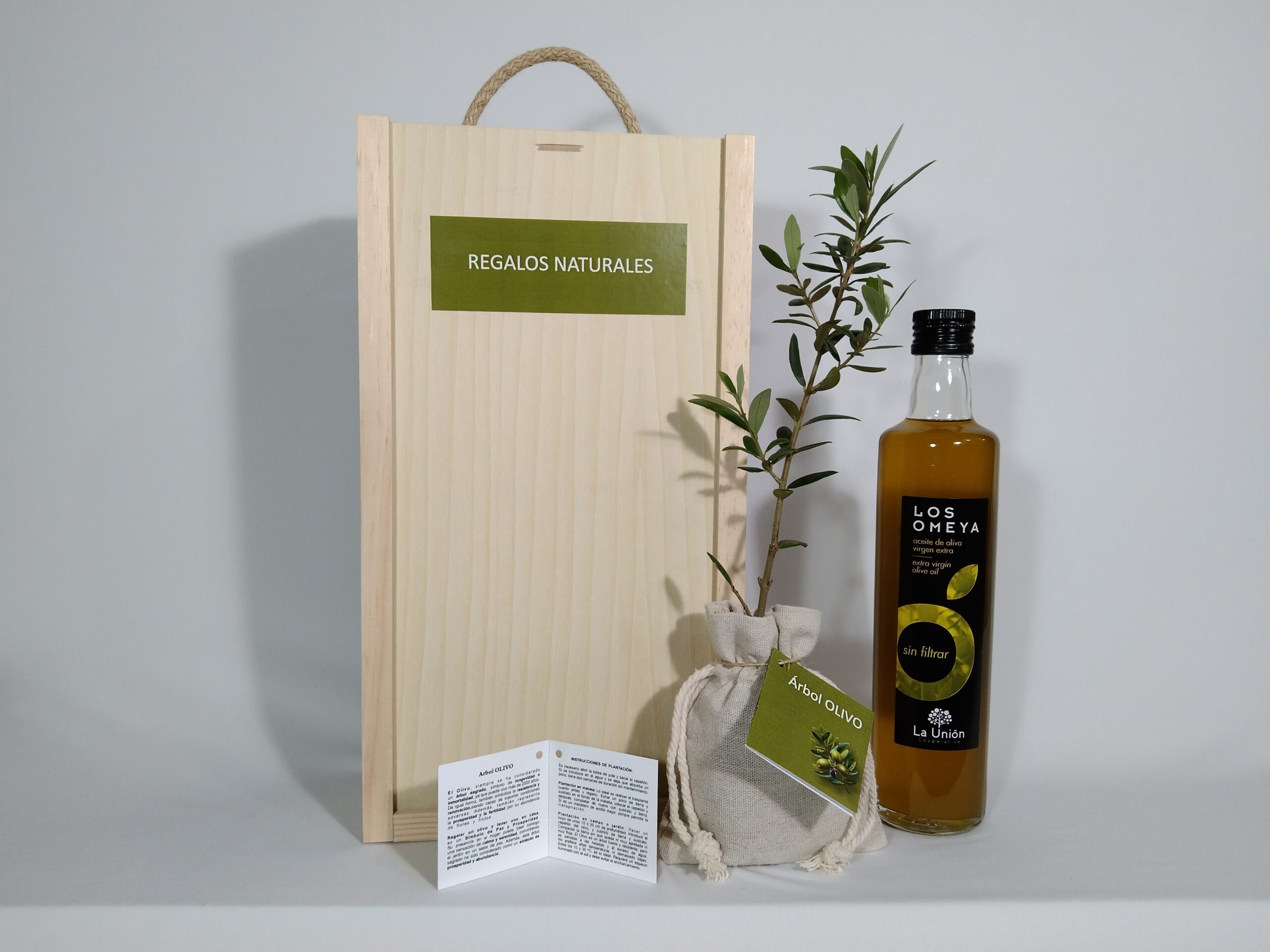 2) ÁRBOL OLIVO en saquito de Yute, tela o Lino.3) CAJA DE MADERA