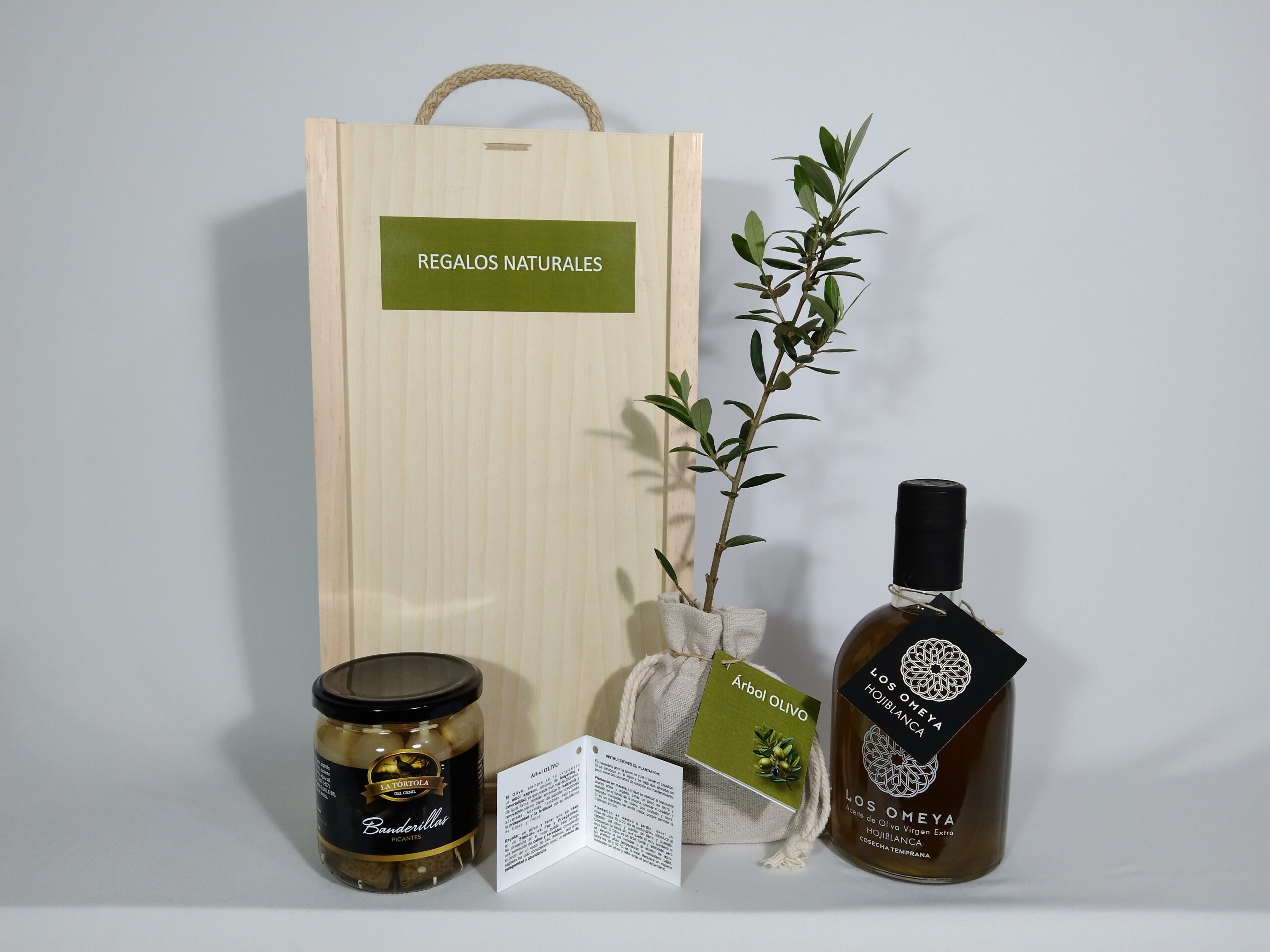 2) BANDERILLAS PICANTES GOURMET: Aceituna sin hueso, pepinillo, cebollita, pimiento y guindilla – Tarro 200 gr.3) ARBOL OLIVO en saquito de Yute, tela o Lino.4) CAJA DE MADERA.